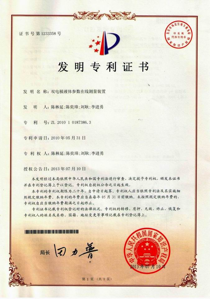 本發(fā)明的目的是提供一個雙電極液體多參數在線測量裝置,結構簡單,工作可靠和使用方便,能同時檢測多個液體的相關參數,自動清洗電極表面,提高檢測精度。我司著重加大對科研的投入力度,積極開展技術創(chuàng)新工作,通過多年來的努力,公司獲得國家專利授權多項,其中發(fā)明專利2項,實用新型專利4項,在審的發(fā)明專利3項。